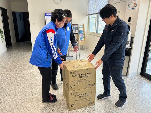 このトイレットペーパーは就労継続支援事業所である青松ワークスさんの利用者の方々が製造されている「エコモア」という商品です。当社もこのトイレットペーパーを使用しています。