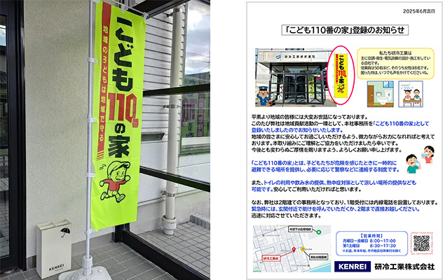 会社の出入口にはステッカーやのぼりを掲示し、いざというときに子どもたちが安心して駆け込める場所として地域に開放しています。 緊急時だけでなく、トイレの利用などでも気軽に利用していただければ嬉しいです。