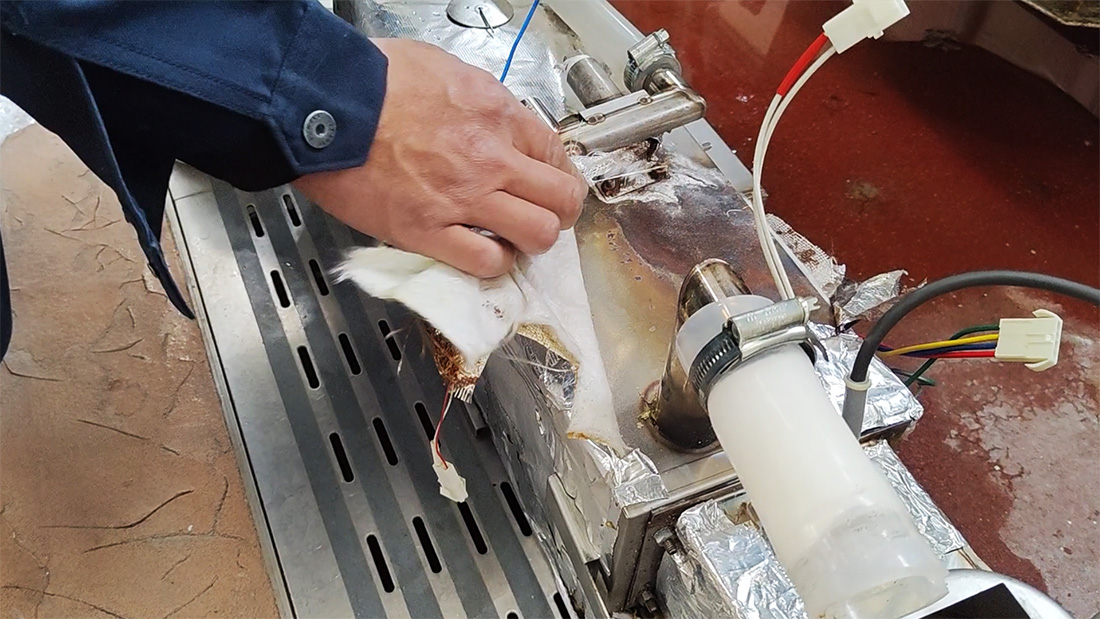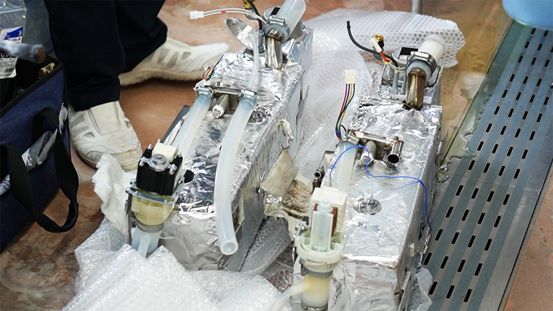 お客様からオーブンのスチーム量が少ないという不具合のご報告を受けて点検を実施したところ、スチームタンクの破損を確認したため交換修理を行いました。